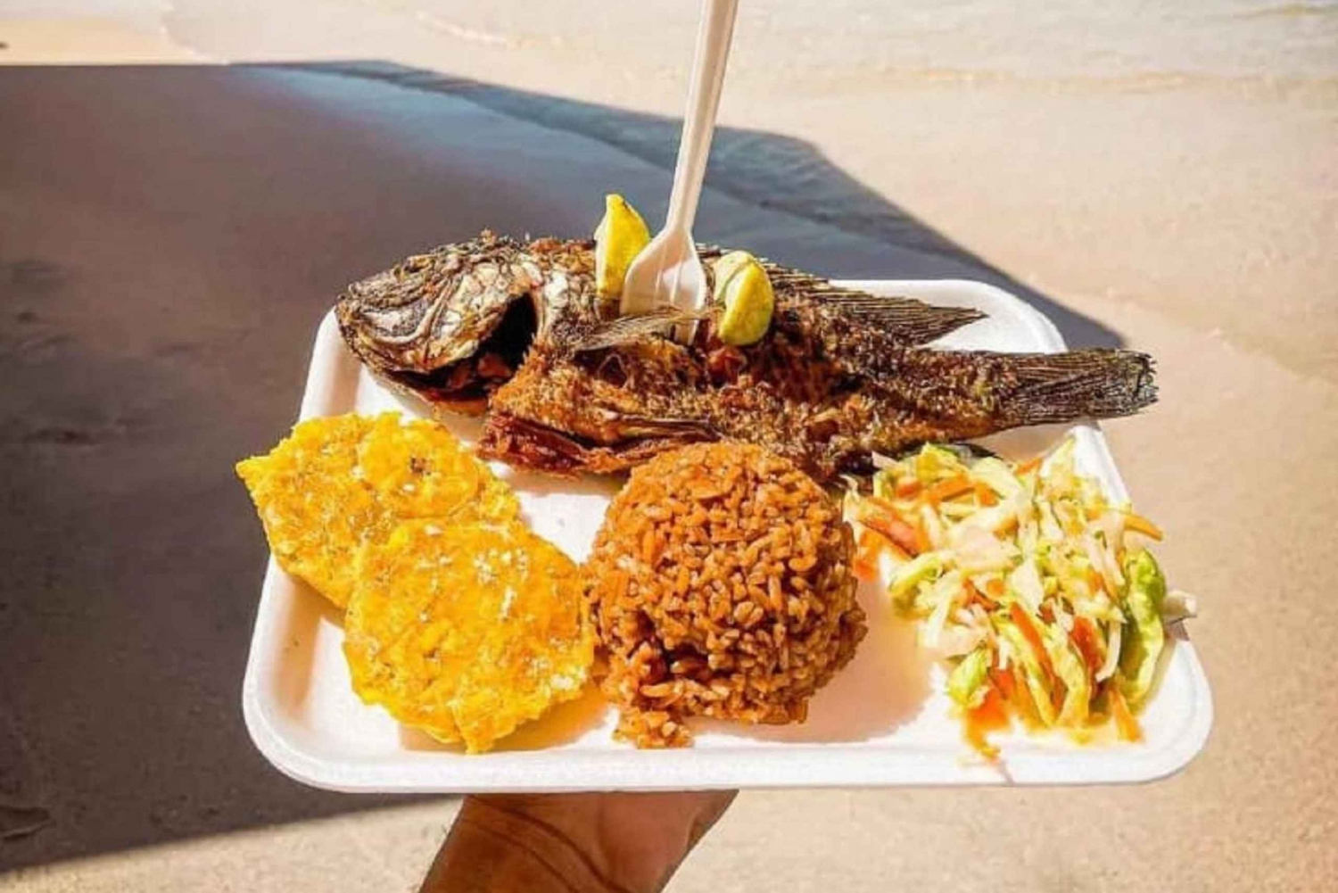 Déjeuner typique (poisson ou poulet, riz à la noix de coco, salade, patacón).
