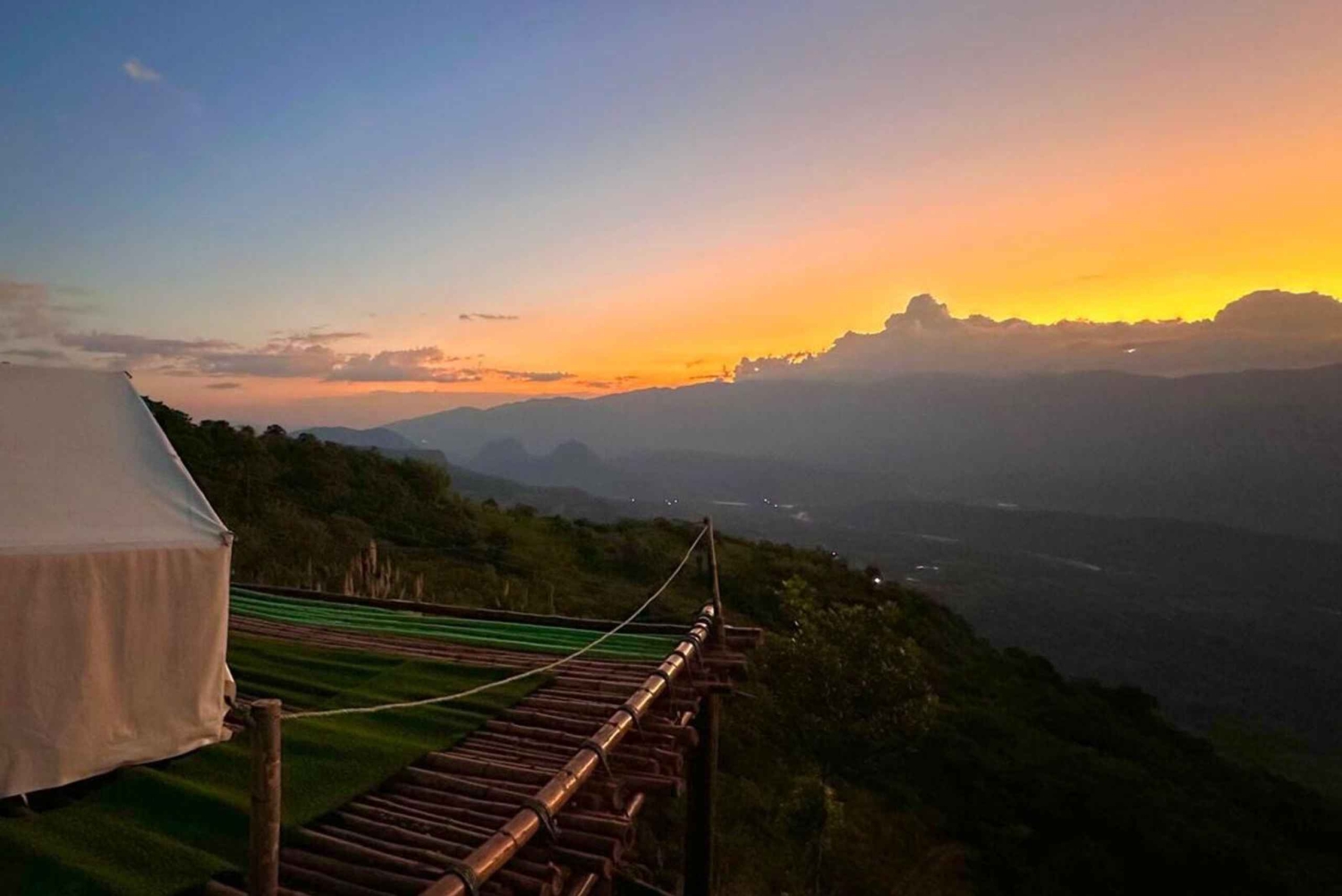 À votre retour, veuillez vous détendre à l'hacienda. Passez la nuit dans une tente de glamping, idéale pour observer les étoiles et vous imprégner des sons de la nature. Profitez d'un accès complet à des espaces de détente exclusifs, notamment une piscine à débordement avec une vue spectaculaire sur les montagnes et un jacuzzi, idéal pour se détendre en regardant le coucher de soleil ou les étoiles.
