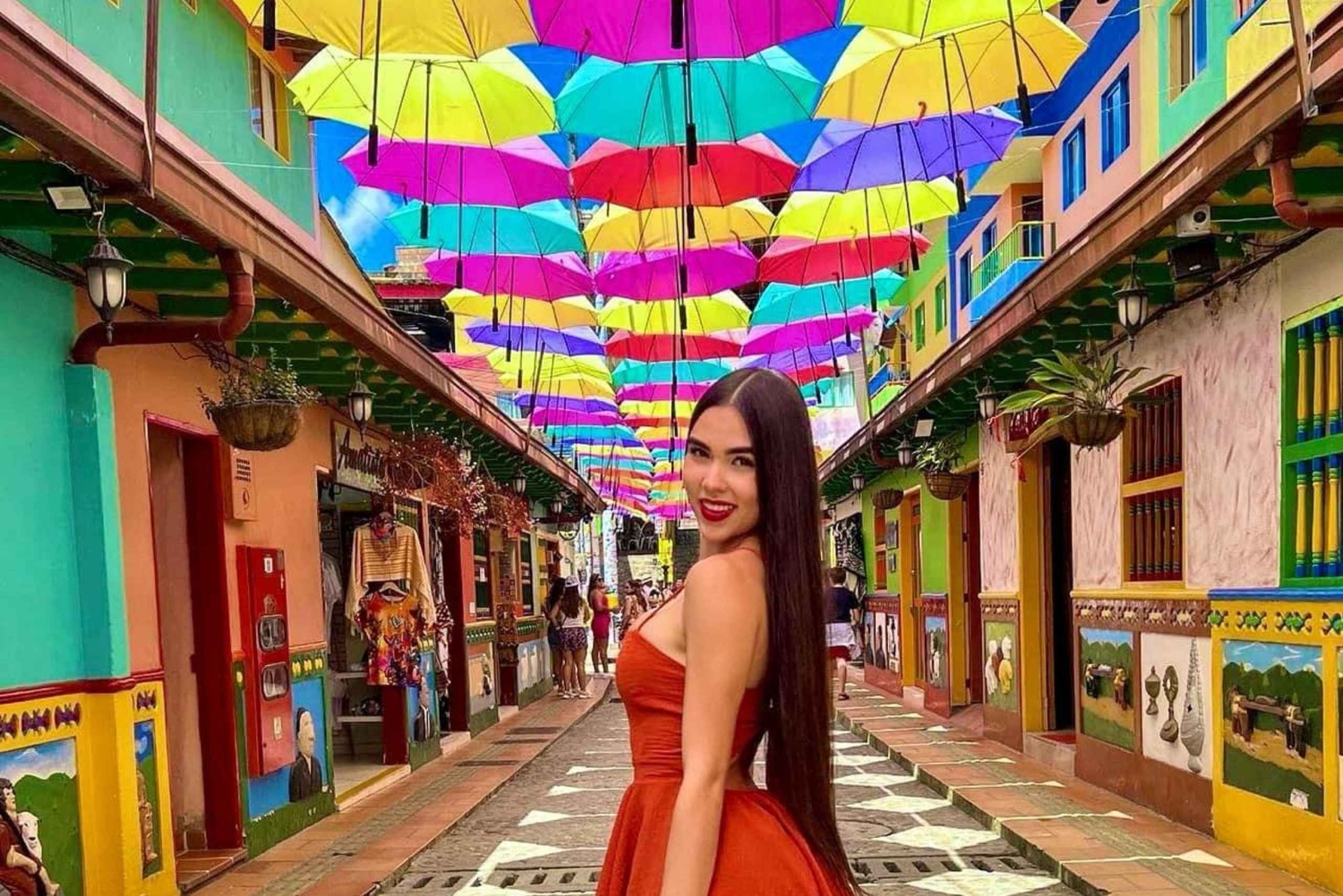 Upptäck Peñol de Guatapé-klippan och njut av en båtutflykt till Pablo Escobars Hacienda La Manuela på denna uppslukande dagsutflykt från Medellín. Ta ett foto på en gata som är täckt av paraplyer.